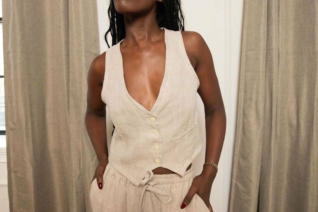This cropped vest, with its deep V-neckline and 4-button closure, adds sleek, effortless style to the collection. Made from lightweight 100% linen or tencel, it’s both breathable and structured—ideal for warm days or light layering. Monochromatic stitching and buttons provide a refined, minimal aesthetic, while the left-side pocket adds subtle utility. Effortlessly versatile, this vest transitions seamlessly from casual to polished settings, embodying the collection’s commitment to honoring the environment and the art of everyday life.